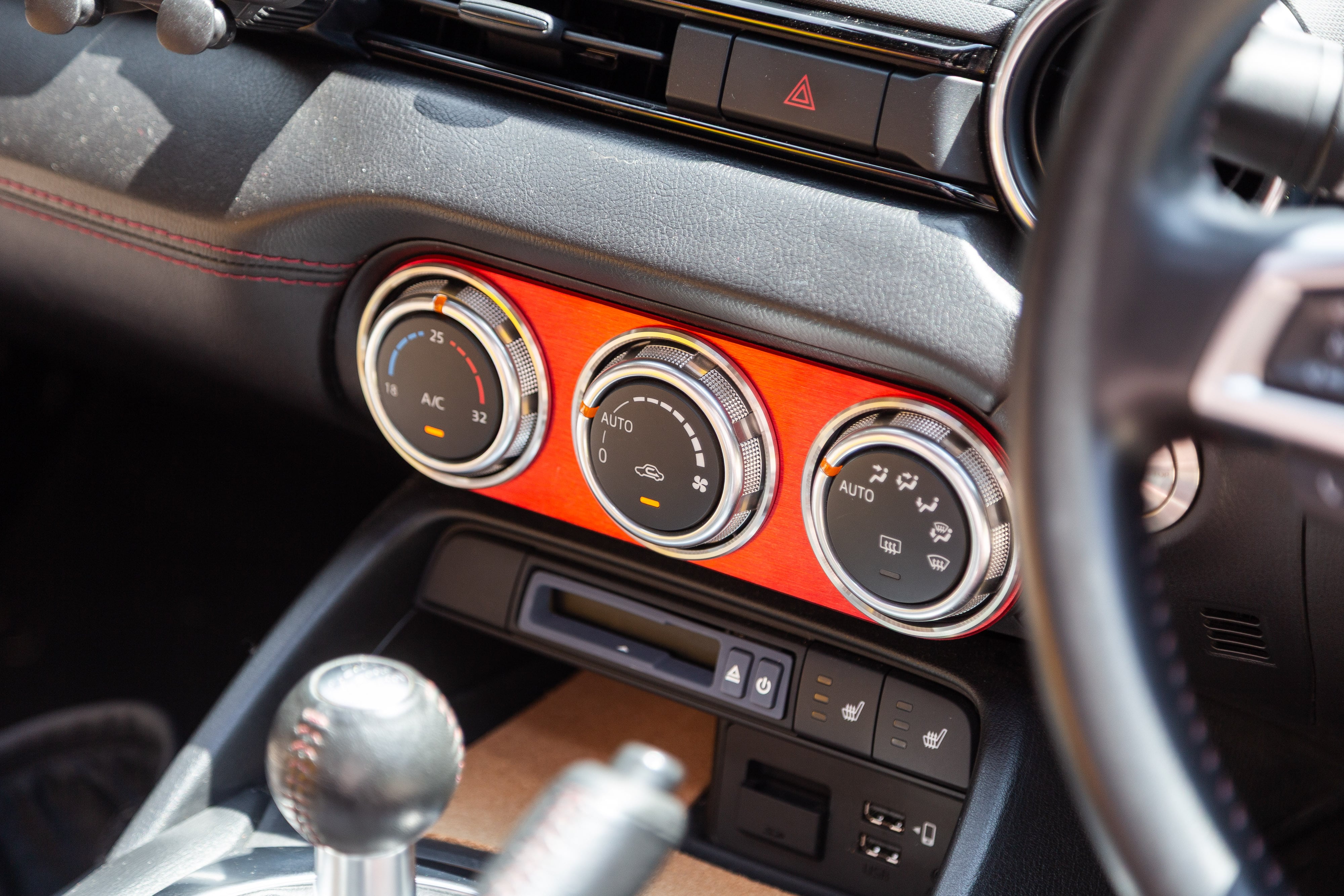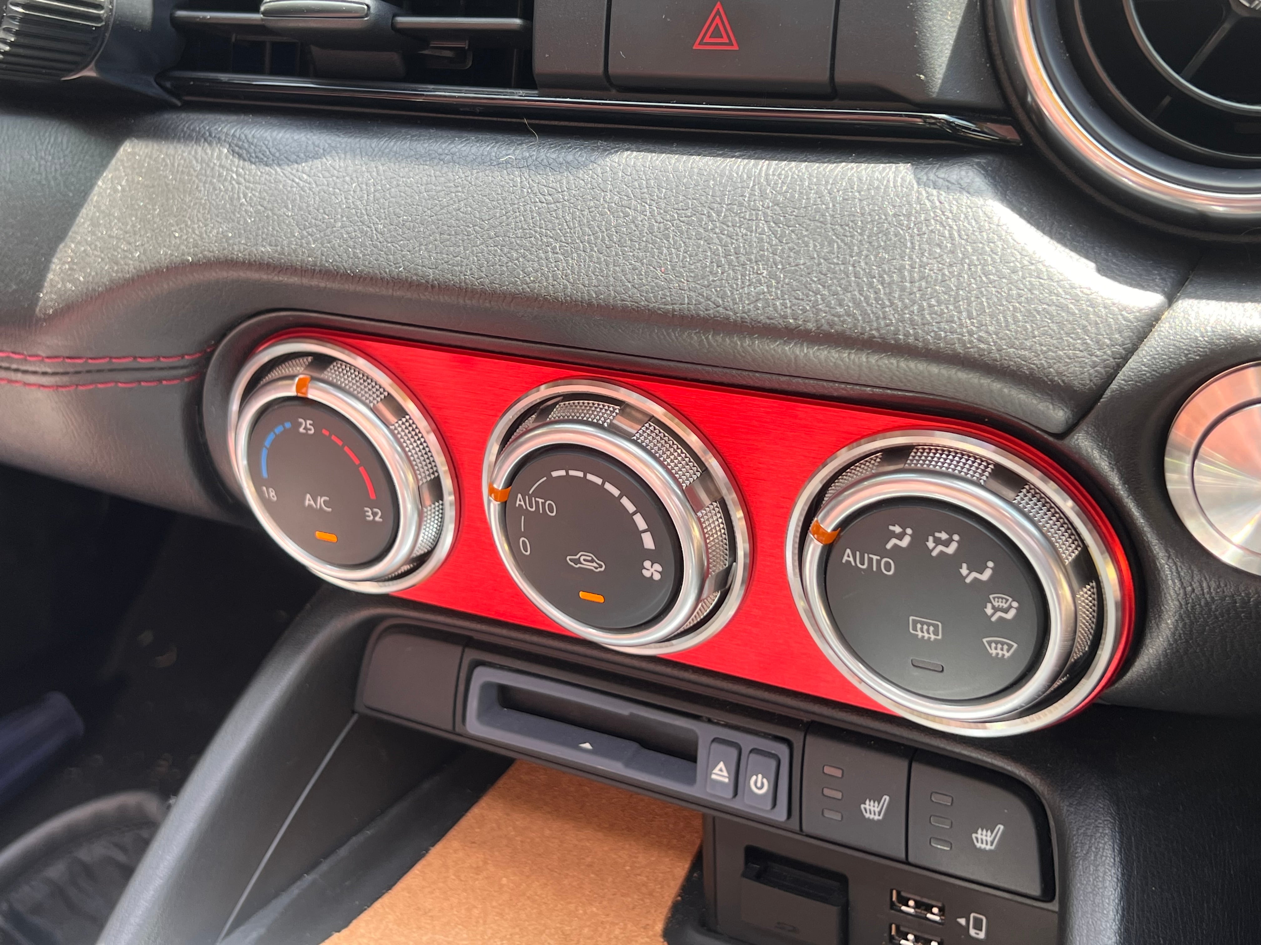 NDロードスターのエアコン操作部に取り付けるヘアライン加工したレッドアルマイト処理したアルミパネルとステンレスのリングを組み合わせたプレミアム仕様のA/C RINGS&STAGEです。