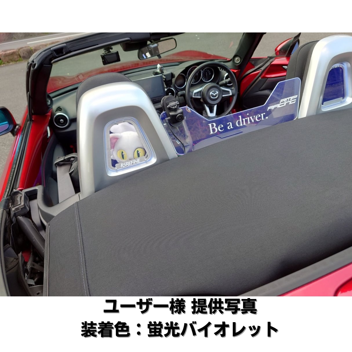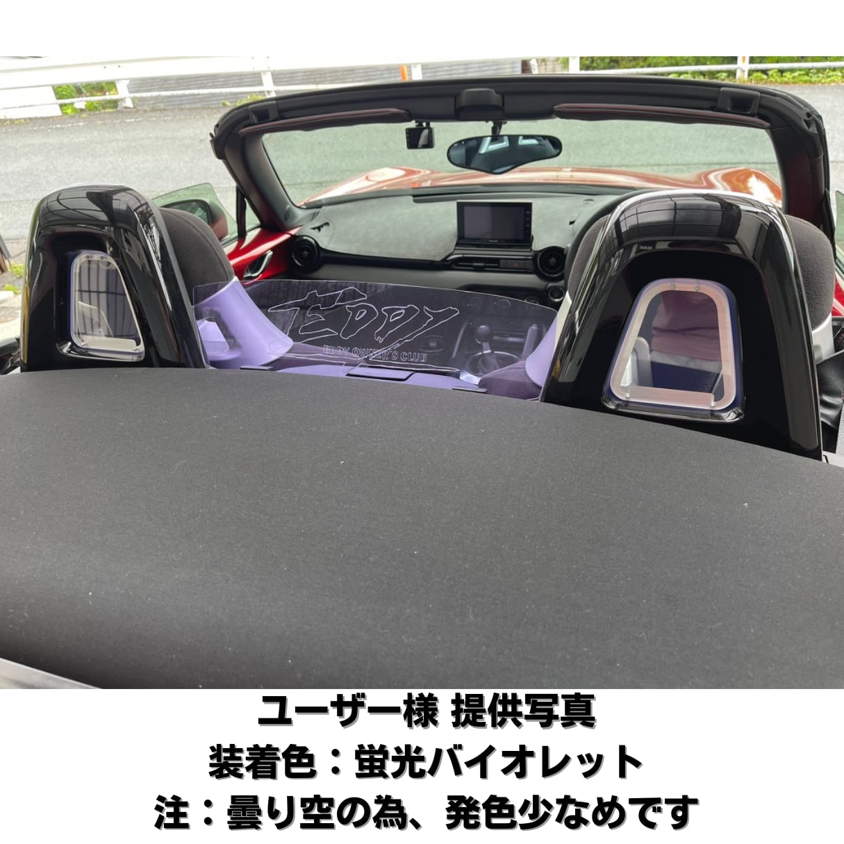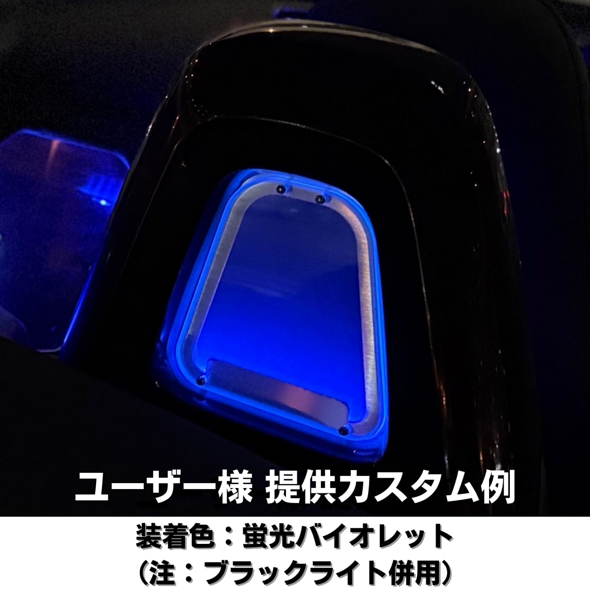 シートバックベゼルのステンレスプレートに装着されたアクリル板が後ろからの印象を変化させます。こちらは蛍光バイオレットになります、他の色は別ページに掲載されています。