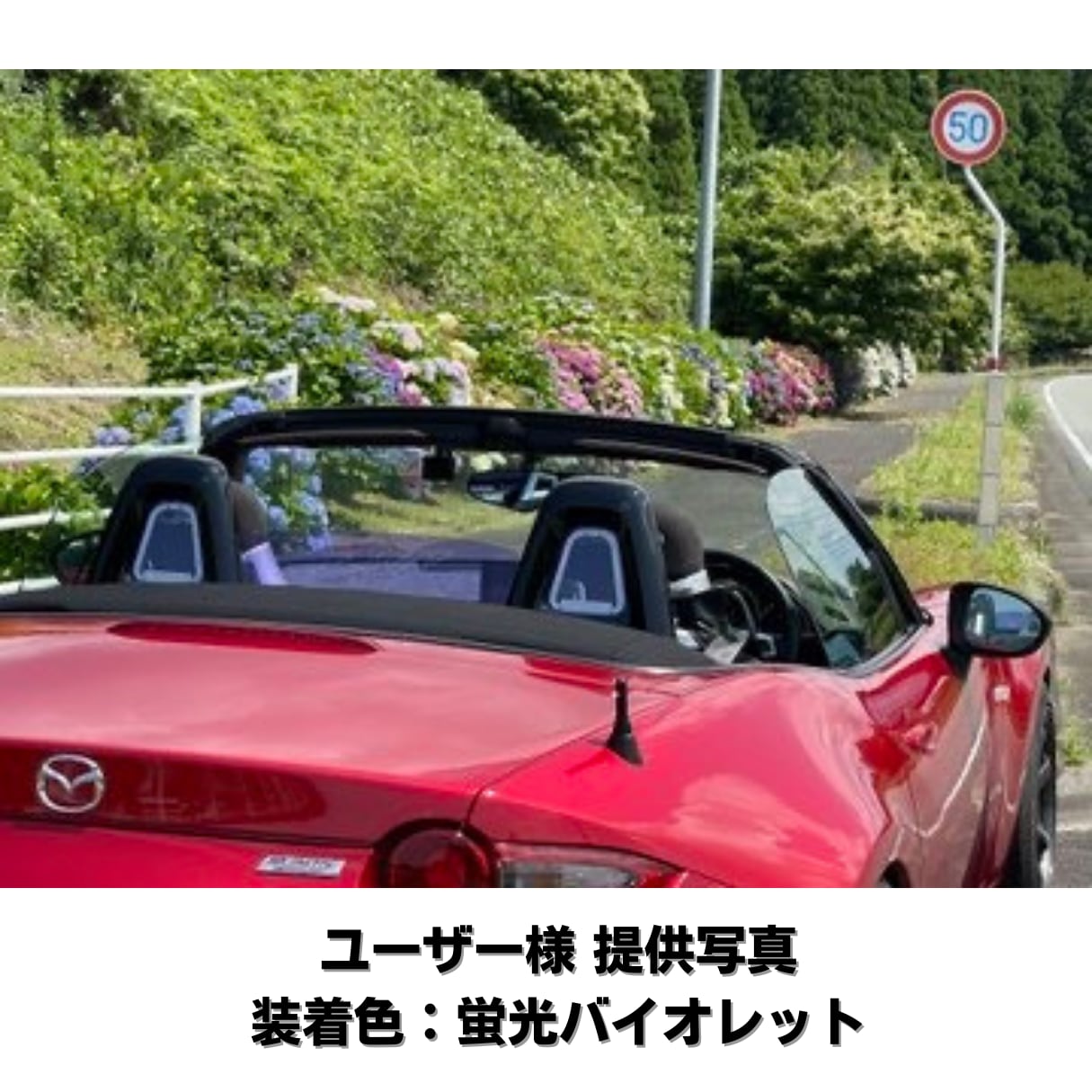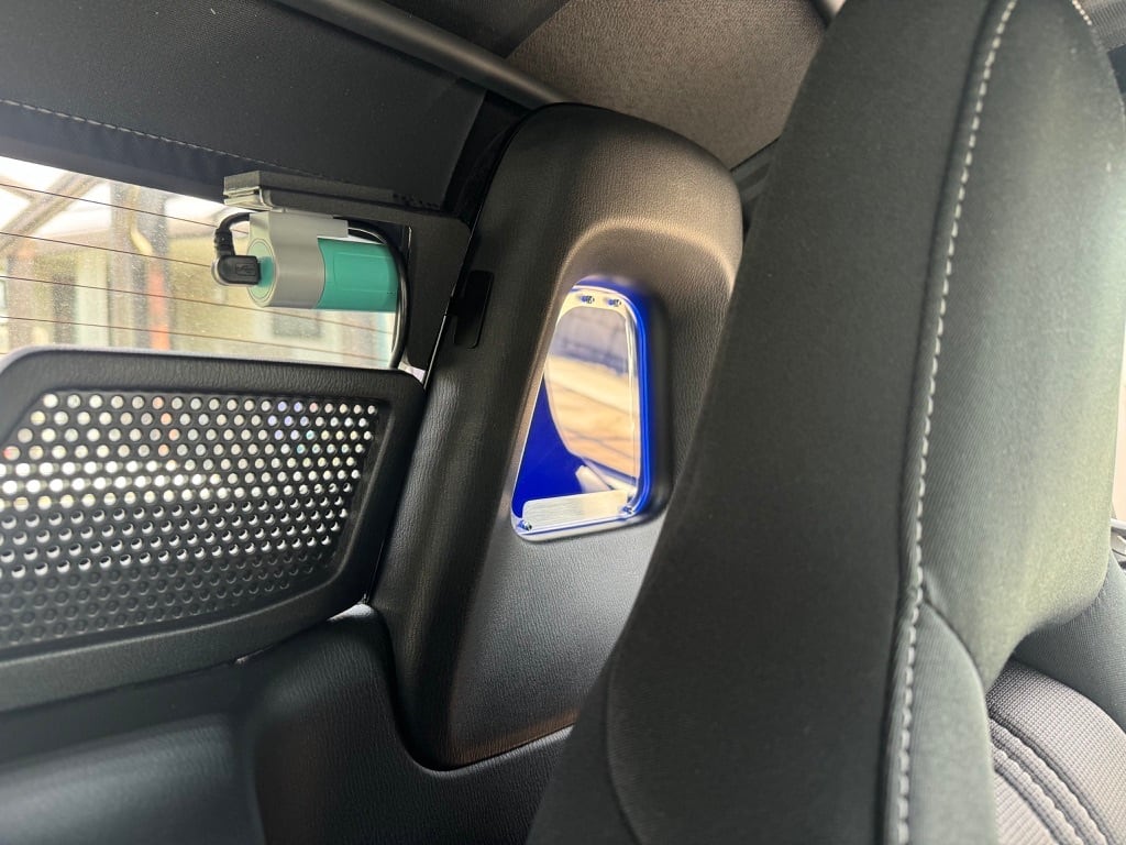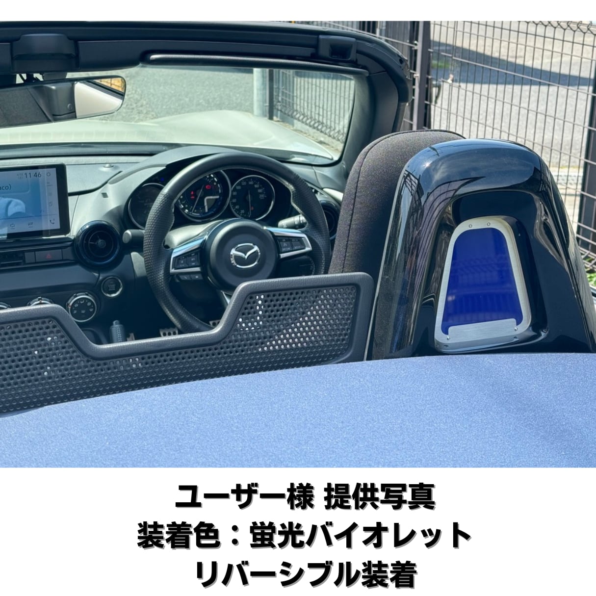 シートバックベゼルのステンレスプレートに装着されたアクリル板が後ろからの印象を変化させます。こちらは蛍光バイオレットになります、他の色は別ページに掲載されています。