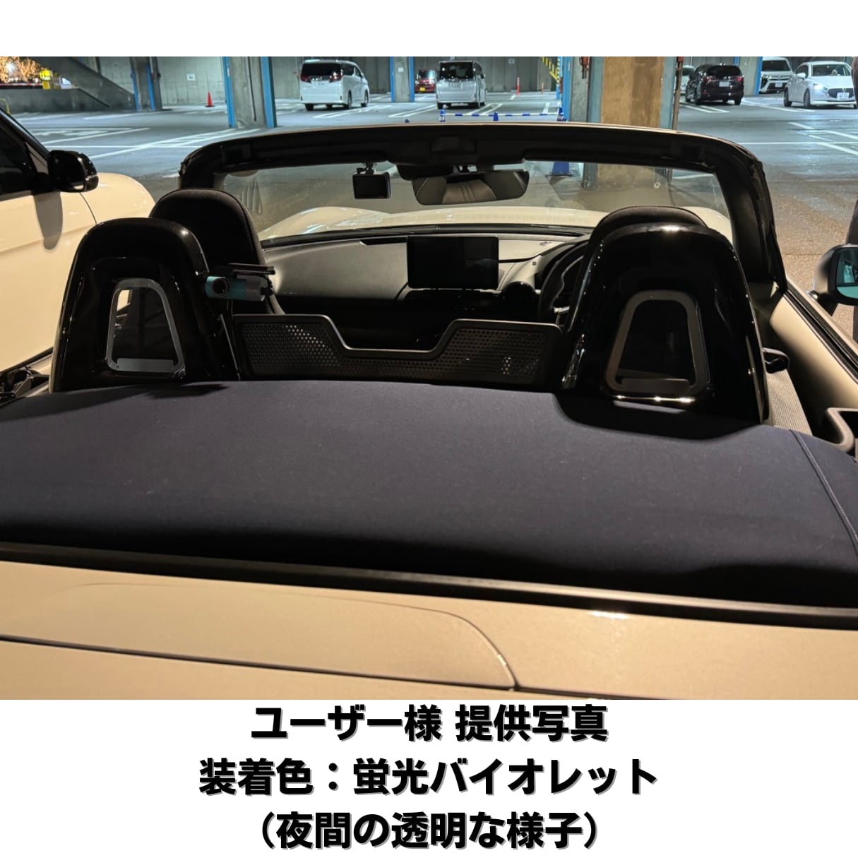蛍光バイオレットは紫外線(日光、ブラックライトが当たると発色し、夜間や室内では透明です。
